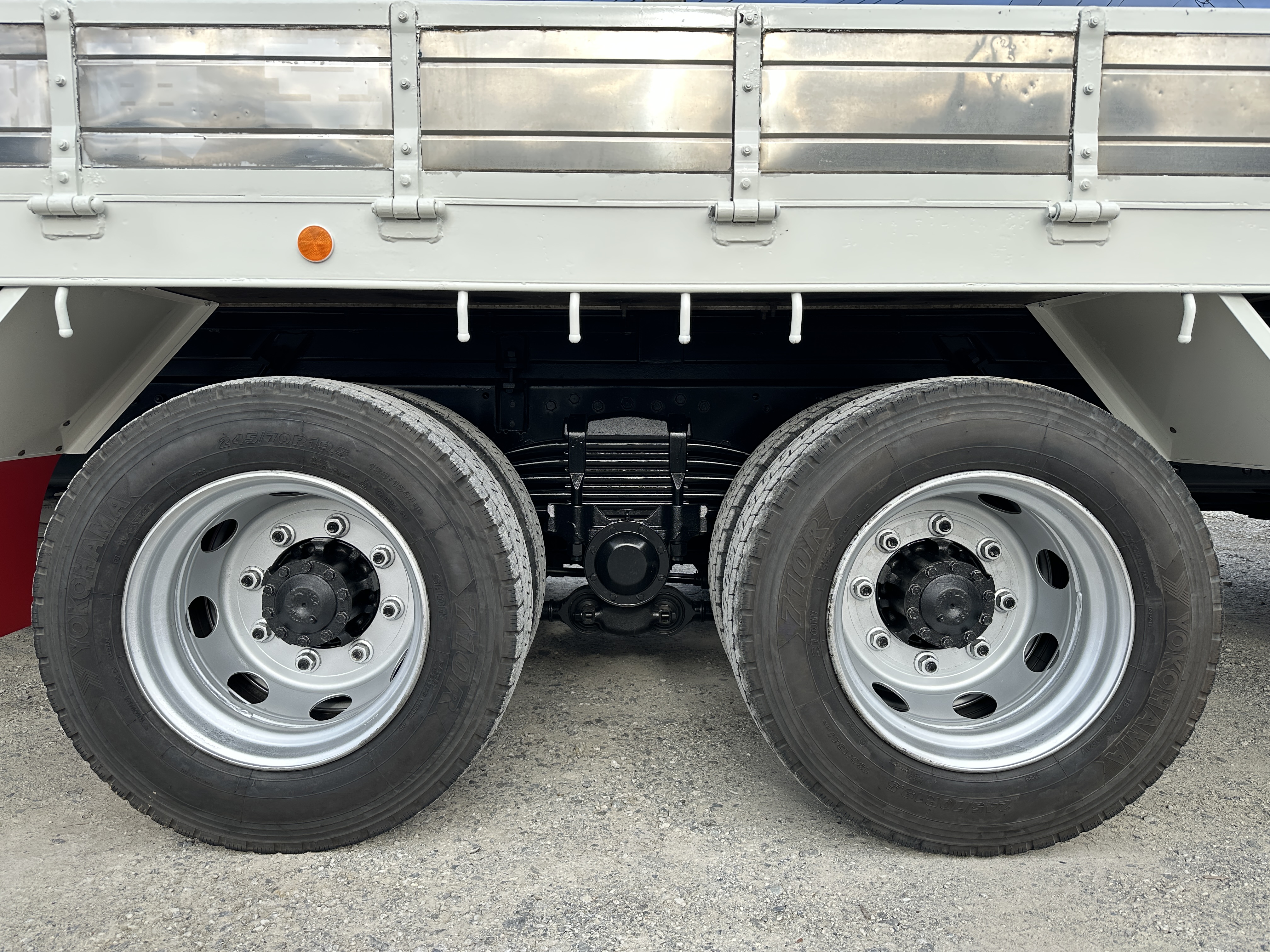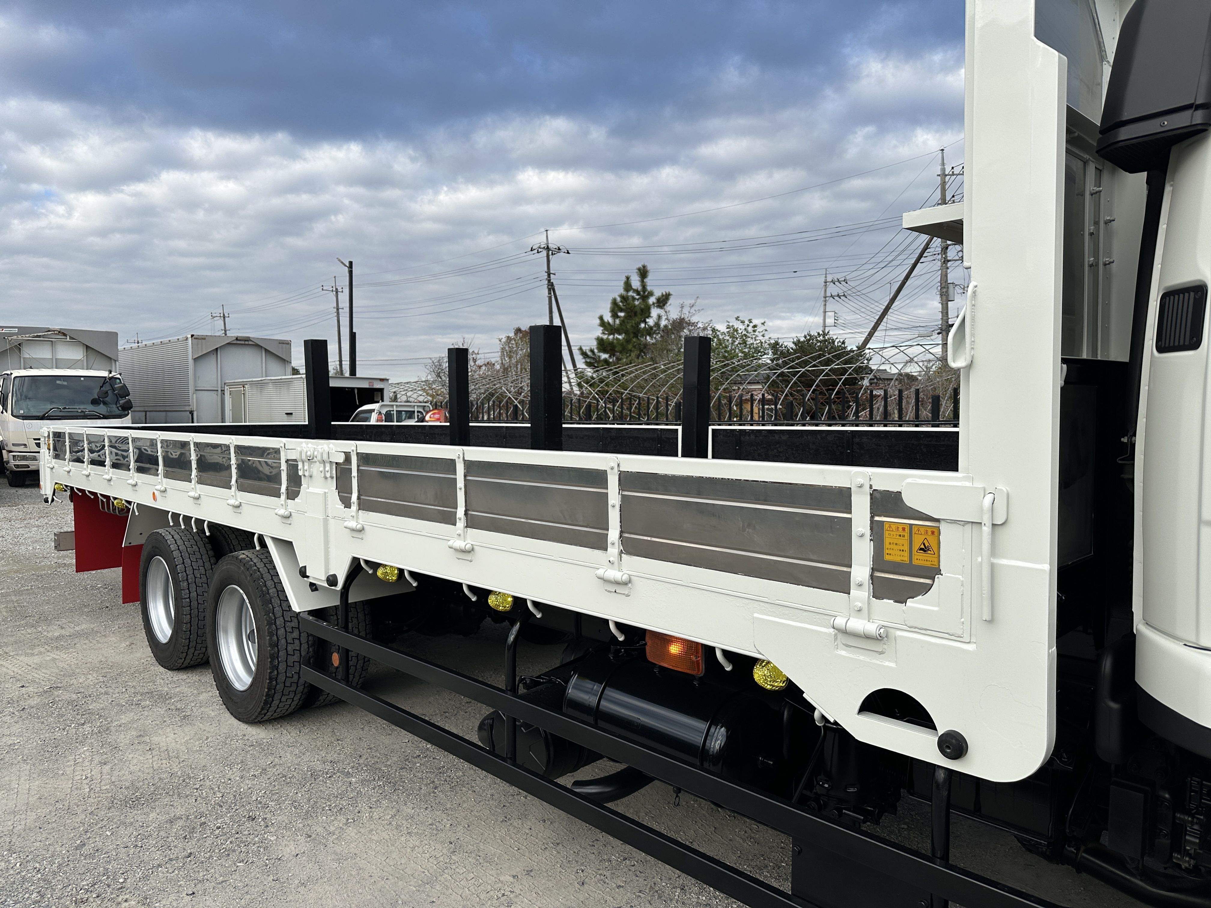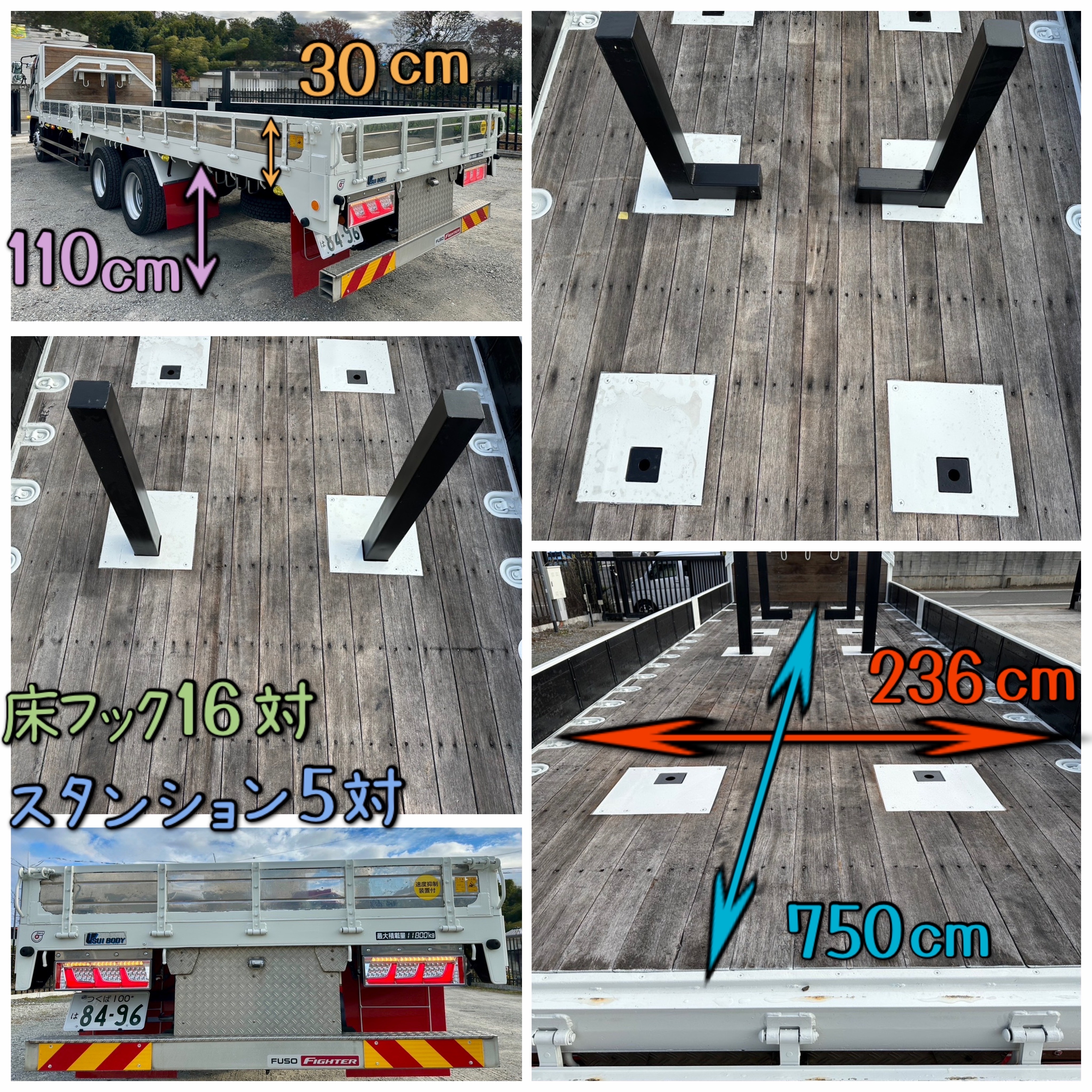 ボデイ内寸法 長さ750cm 幅236cm アオリ高さ30cm ホイールベース572cm 地上高110cm スタンション5対 床フック16対 AC/PS/PW/AIRBAG/ABS/6MT/ETC/2デフ バックカメラ |